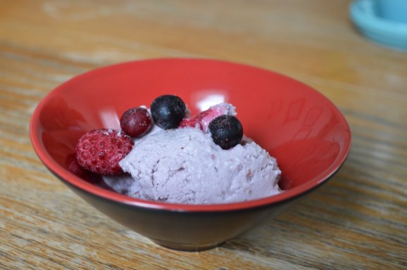 This time, I made sure to follow all of the ice cream maker instructions to the T, but I took too long with the salt and ice layers and my ice cream started freezing before I got the darn thing turned on. It wouldn’t turn because the motor wasn’t strong enough to turn through the frozen-ness. I pretty much felt like a failure at this point, but I ran the outside of the ice cream container under hot water for a few seconds and then tried again. After about 20 minutes I finally had real (non dairy) ice cream! The full fat coconut milk made it extra creamy and the berries hide the coconut-y flavor.
