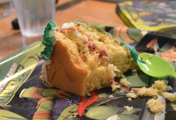 I used tooth picks to hold him in place on the cake. I tried to write “Happy Birthday” but the icing wasn’t as thick as the grass and just kind of dissolved. No one noticed.